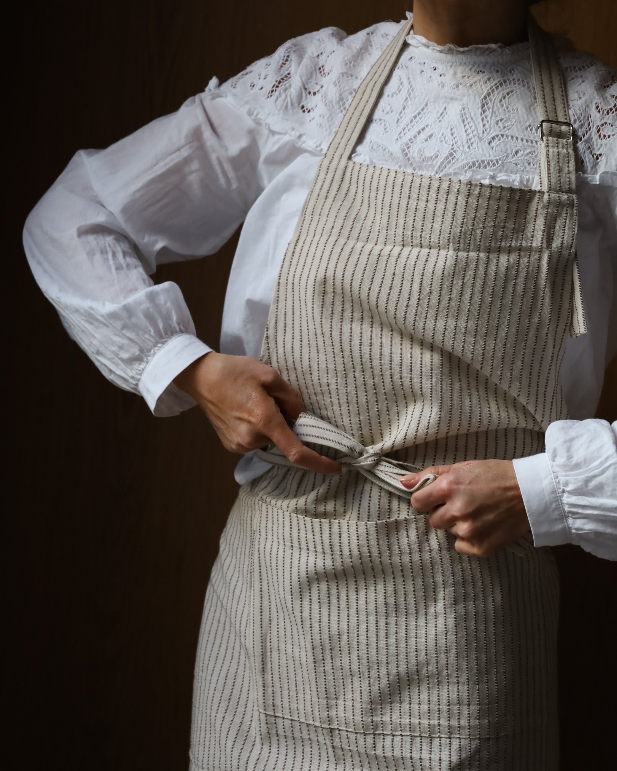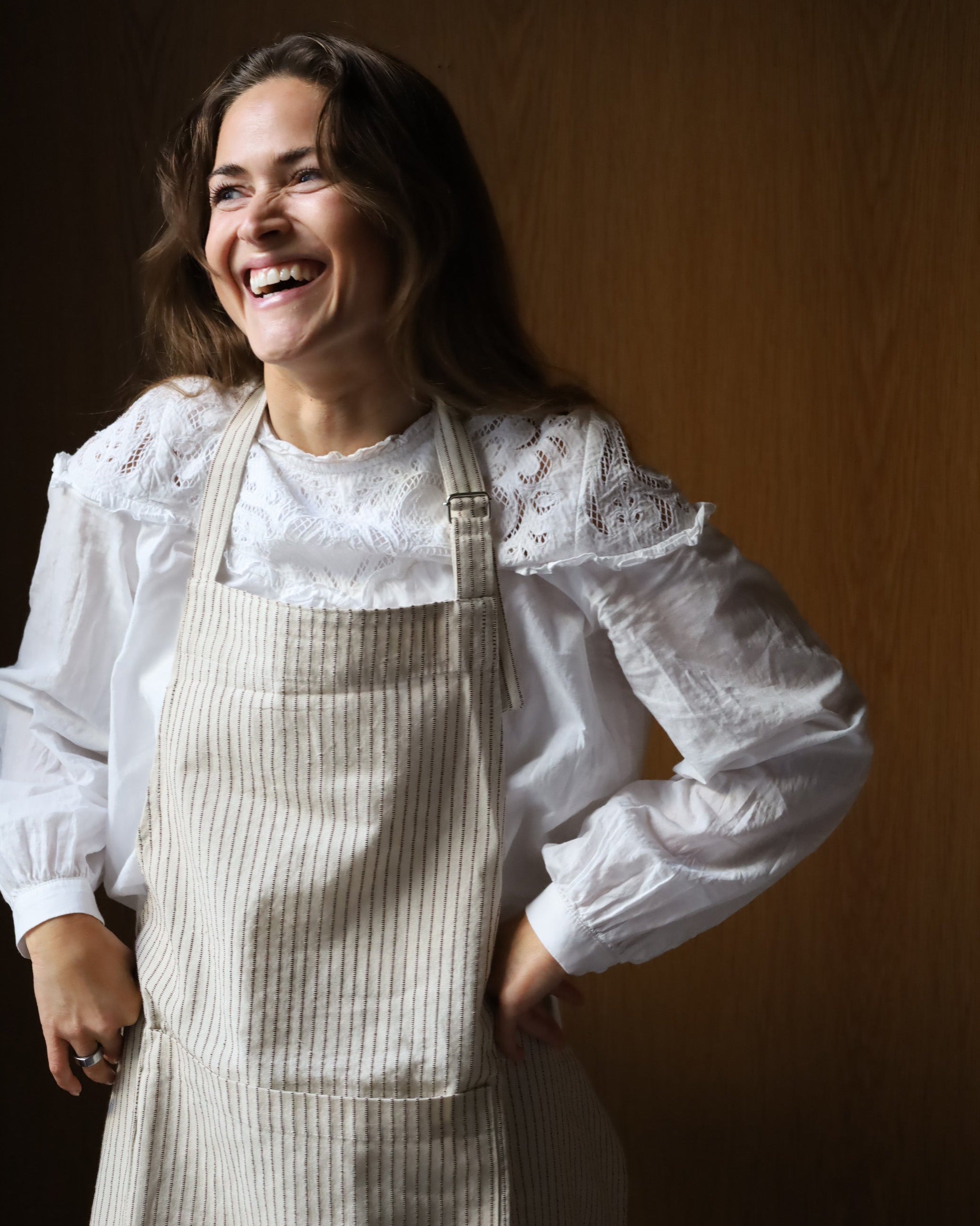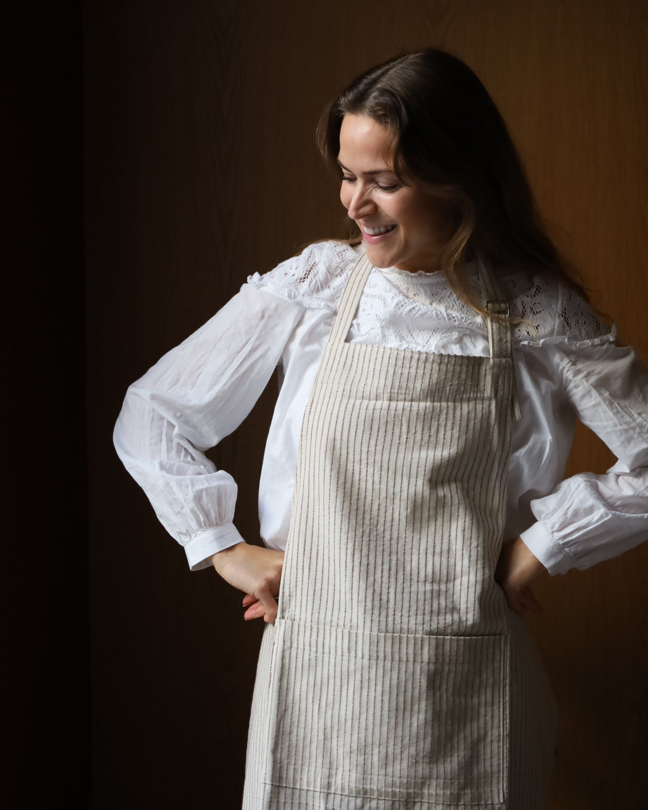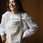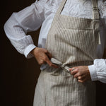 Et tidløst forkle med beige bunn og smale brune striper – et elegant og naturlig uttrykk som passer inn på ethvert kjøkken. Det myke og slitesterke bomullsstoffet gjør det ideelt både til matlaging, servering og kreative prosjekter.