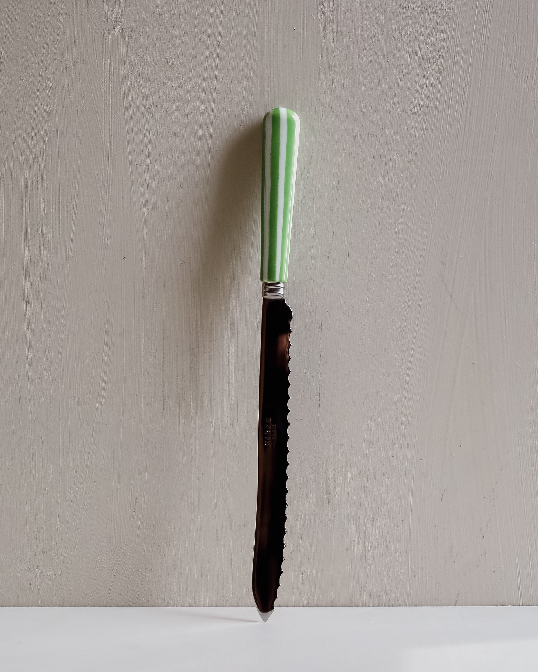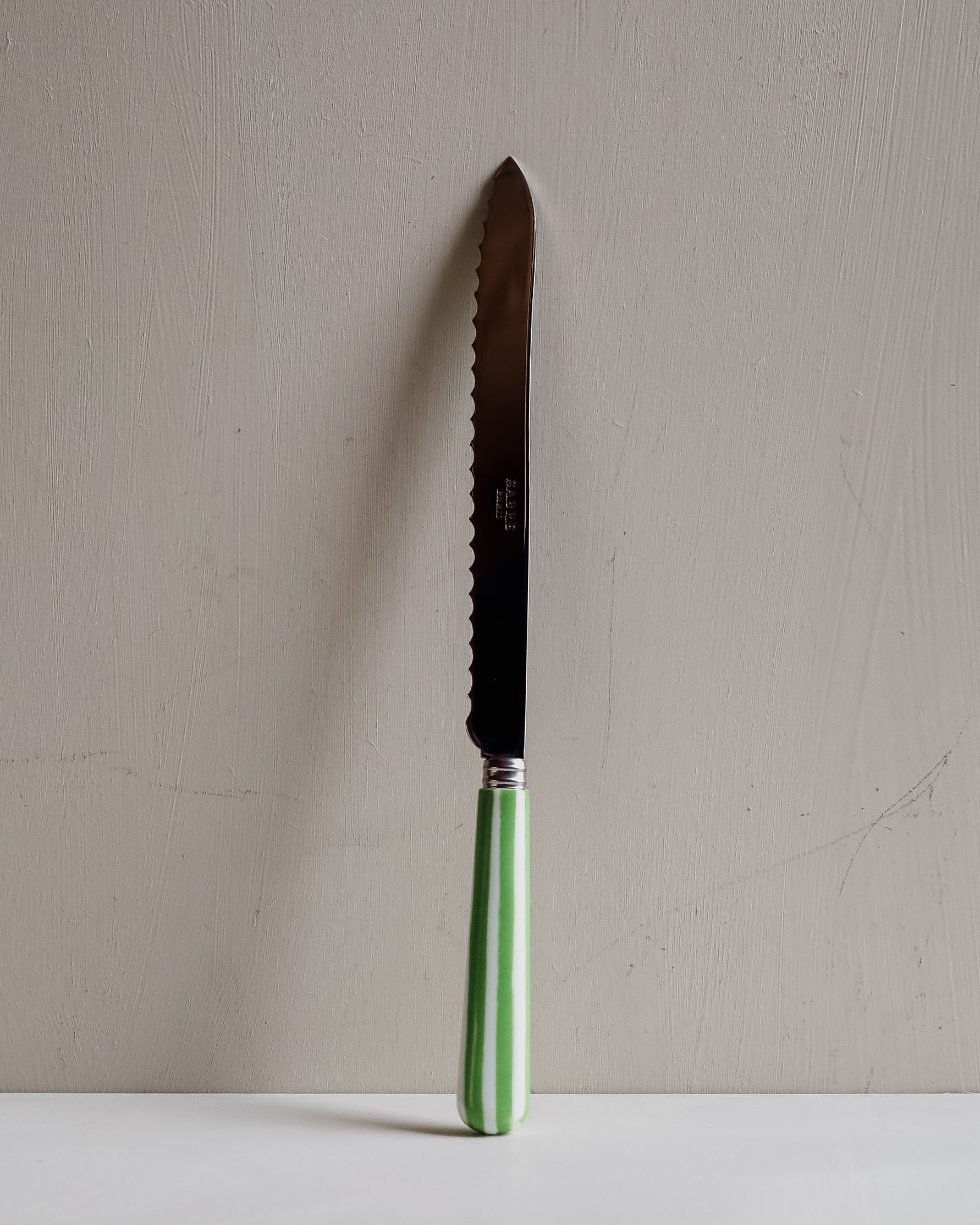 Oppdag elegansen og funksjonaliteten til Sabre Paris brødkniv i grønn, en perfekt kombinasjon av fransk håndverk og tidløst design. Denne mindre brødkniven er ideell for å skjære mindre bakverk som rundstykker, croissanter og brioche, samtidig som det serraterte bladet gir rene snitt uten å knuse det luftige innholdet.