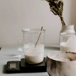 Dag 3: Nå bør det begynne å danne seg bobler. Hell ut og kast 100 g av innholdet. Tilsett 30 g rugmel, 30 g hvetemel og 60 g vann. Rør og sett tilbake.