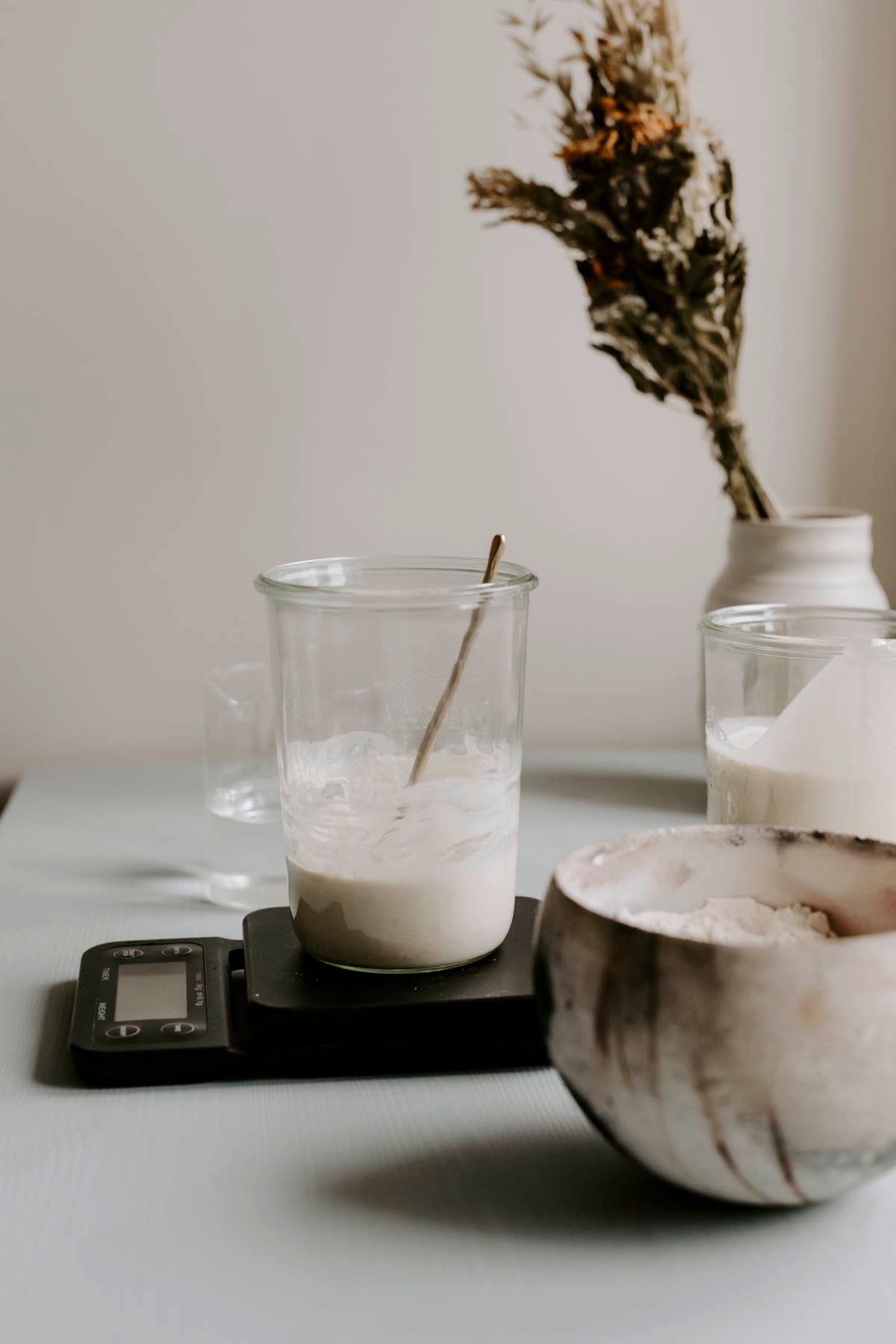 Dag 1: Bland 15 g rugmel, 15 g hvetemel og 30 g lunkent vann i glasset. Rør godt, legg lokket løst på og la det stå i romtemperatur.